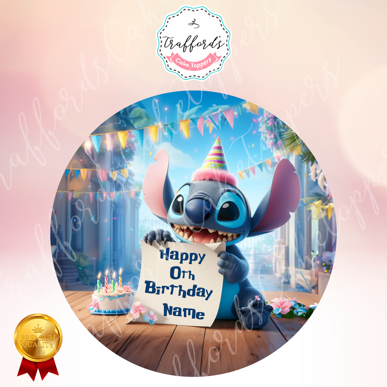 Introducing our custom Stitch inspired cake topper! Personalize it with your preferred name and age to make it unique or have it on its own. Your customization details will be beautifully incorporated into the design, just like the example image provided for this item.